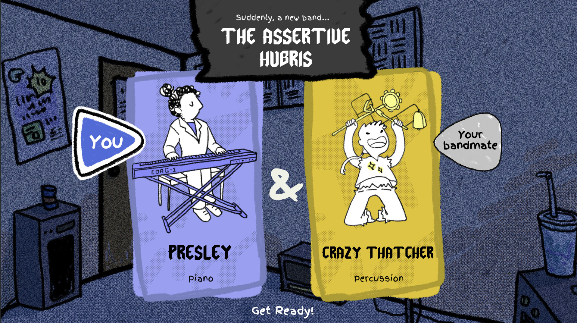 You start in The Venue, your favorite spot to hang out and watch bands! The bands playing are all other players' creations. Your ratings will affect how often that band is booked for shows in everyone else's games. When you start making a song, you'll be given a random instrument and bandmate, and you'll create a 10 second track.
